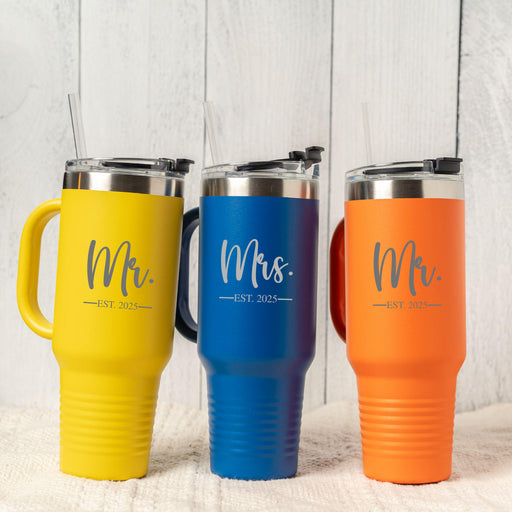 Celebrate the newlyweds with this beautifully engraved 40oz Mr. & Mrs. tumbler. Featuring a timeless “Mr. & Mrs. Est. 2025” design, this du...